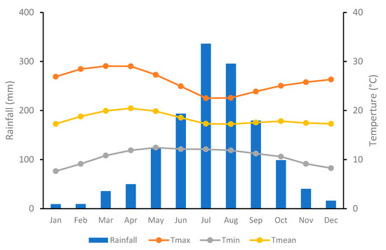 Monthly maximum temperature (Tmax), minimum temperature (Tmin), mean temperature (Tmean), and mean rainfall in the Birr River watershed (1986–2018).