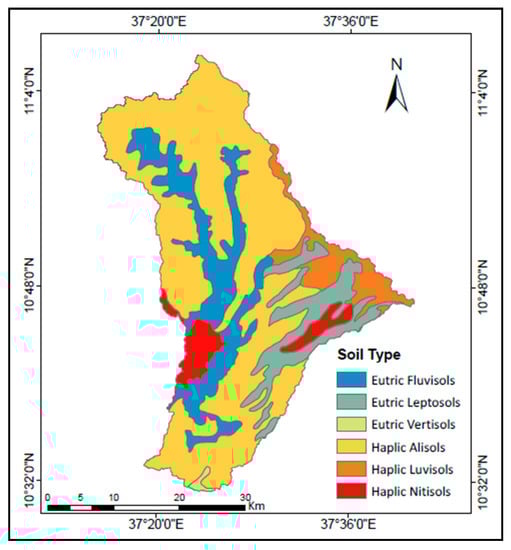 A spatial dataset of digital elevation model (DEM), soil, and LULC was employed to simulate the SWAT hydrological model. DEM data is required to define watershed and sub-watershed boundaries, as well as the delineation of the hydrological response unit, and slope reclassification. DEM data with the 30-m spatial resolution was obtained from the Shuttle Radar Topographic Mission (SRTM) USGS website http://earthexplorer.usgs.gov/ (accessed on 1 August 2022) [59]. The soil and LULC map along with the watershed and sub-watersheds delineated from DEM was used to determine the hydrological parameters and the Hydrological Response Units (HRUs). The soil map was collected from the Ethiopian Ministry of Water, Irrigation, and Energy (MoWIE). There are six major soil types found in the Birr River watershed, which include Haplic Alisols, Eutric Fluvisols, Haplic Luvisols, Eutrc Leptosols, Haplic Nitisols, and Eutric Vertisols (Figure 3). Among all soil types Haplic Alisols is most dominated soil types, which covers about 816 km2 (59.78%) followed by Eutric Fluvisols 236 km2 (17.29%), Eutrc Leptosols 125km2 (9.16%), Haplic Luvisols 96km2 (7.03%), Haplic Nitisols 65km2 (4.76%), and Eutric Vertisols 5km2 (0.37%). The Birr River watershed’s detailed soil physical and chemical property parameters, such as soil texture, bulk density, available water content, hydraulic conductivity, soil depth, and organic carbon content, were derived from the world’s digital soil map [60].