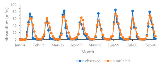 Comparison of observed and simulated streamflow for model calibrated value (1994–2001).