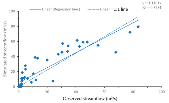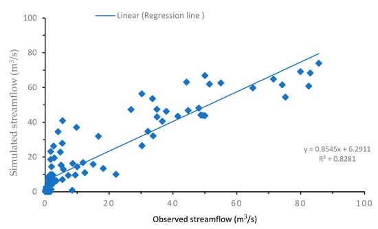 Scatter plot between observed and simulated streamflow for model validation period (2002–2005).