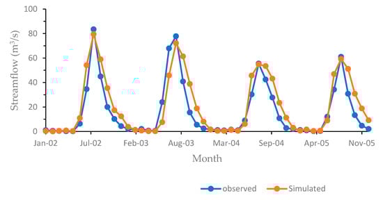 Observed and simulated streamflow for a model validation value (2002–2005).