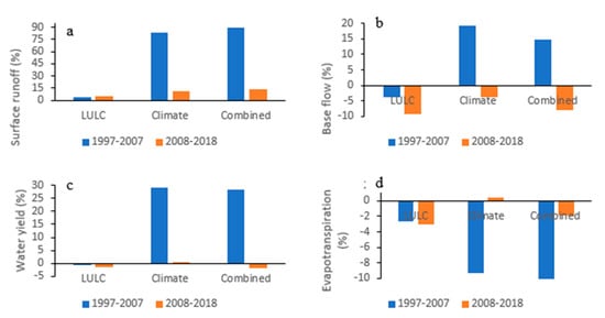 Individual LULC changes in the Birr River watershed also showed a positive increase in surface runoff while decreasing baseflow, however, the amount of increment is small (Table 11, Table 12 and Table 13). From 1997–2007 and 2008–2018, surface runoff increased by 3.63% and 4.71%, while baseflow changes by −3.77% and −9.34%, respectively (Figure 8a,b). The primary cause of the growth in surface runoff and decline in baseflow is agricultural land and small-extent settlement expansion, which reduces the water infiltration rate in the watershed. Thus, surface runoff increases and reduces baseflow characteristics in the study Birr River watershed. Between 1986 and 2018, the area of agricultural land and settlements increased by 24.49% and 54.78%, respectively, resulting in more surface runoff and reduced baseflow (Table 8). Agriculture and settlement areas increased to 9.4% and 43.15%, respectively, during 1986–2001, resulting in increased surface runoff. Agriculture and settlement areas also further increased to 13.23% and 19.38%, respectively, during 2001–2018, which showed increased surface runoff and reduced baseflow. This result is consistent with previous studies by [6,7,75,91,101]. Agricultural and settlement areas increase impervious areas, which reduces soil infiltrations. Flooding becomes more frequent and severe as baseflow decreases and surface runoff increases [92,93,102]. The increase in surface runoff and decrease in baseflow is also attributed to due to a reduction in water bodies, forests, and bushlands.
