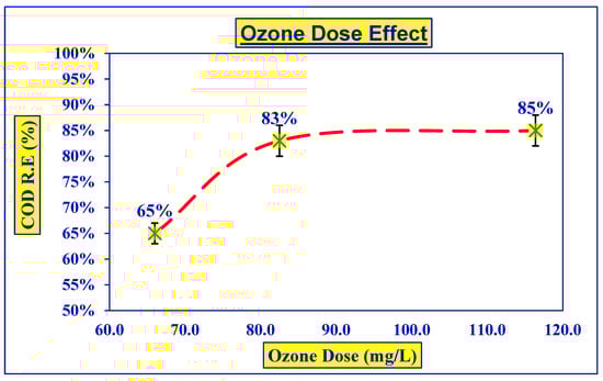 The ozonation dose optimization was performed on the removal of COD by varying the ozone dose at a constant contact time of 15 min. The effect of ozone dose on COD removal in real ASSWW was presented in Figure 2. It was observed from Figure 2 that maximum COD removal efficiency of 89% was achieved at an ozone dose of 116.4 mg/L. While comparing the removal efficiencies at different ozone dosages, it was observed that there was a negligible difference in ozone dose concentrations of 82.5 mg/L and 116.4 mg/L with COD removal of 83% and 85%. The optimum ozone dose of 82.5 mg/L was selected for the current investigation.