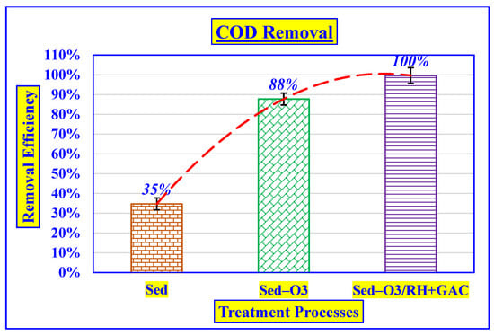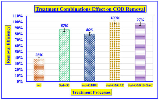 The removal rate of COD was studied in the current investigation because the ASSWW contained various types of chemical constituents from snow foam, detergents, oil and grease. Thus, the COD must be analyzed in ASSWW as these chemical substances contributed to the COD value. The removal efficiencies of COD were presented in Figure 7, it was revealed that 100% COD removal efficiency was achieved by hybrid combination-III (Sed–O3/RH + GAC). Moreover, a significant reduction in COD was found in real ASSWW by this efficient hybrid process (Figure 7) as compared to other full treatment units (coagulation/flocculation/sedimentation, sand filtration, ceramic ultrafiltration and reverse osmosis). It was found that 96% of COD was removed by this lengthy and expensive treatment unit; moreover, sludge management involves additional costs [22].