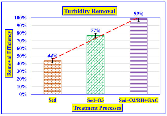 Figure 6. Turbidity removal by hybrid system (Initial turbidity = 669 ± 16 NTU; O3 = 82.5 ± 2.2 mg/L; peristaltic pump speed = 150 rpm; C.T = 18 min; GAC = 200 g; RH = 200 g; pH = 6.9 ± 0.2; volume = 4 L; T = 25 ± 2 °C).