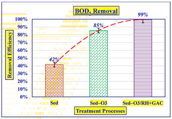In order to treat the car wash service station wastewater and recycling of ASSWW for irrigation purposes, the removal of BOD5 must be assessed. In the current investigation, the removal rate of BOD5 by the efficient combination is presented in Figure 8. The novel treatment combination achieved a 99% removal efficiency of BOD5 and complied with the IWQGs recommended standard value of BOD5 (Table 4) for Class D proposed by [42]. The integrated method (flocculation flotation, sand filtration, ozonation, and chlorination) was studied by [17] for the treatment of car wash effluent. The results revealed that 26.95% of BOD5 was removed by flocculation flotation and 84.76% was achieved with the integration ozonation process taking a longer reaction time of 60 min. In the current investigation, the ozonation time was about 18 min, which may save the electrical energy demand and cost of treatment by the Sed–O3/RH + GAC process.