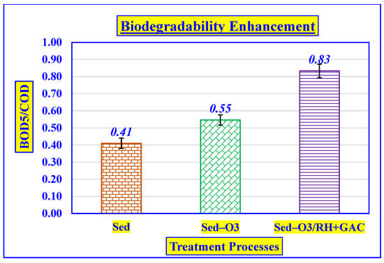 In the current investigation, more than contaminants removal, the efficacy of the novel treatment method was also evaluated by considering the biodegradability (BOD5/COD ratios) of ASSWW. Figure 9 shows the improvement in biodegradability by Sed–O3/RH + GAC process from 0.41 to 0.83 and makes the real ASSWW biodegradable for future research. The wastewater is significantly treatable by biological treatment if BOD5/COD ratio is greater than 0.5 [33,43].