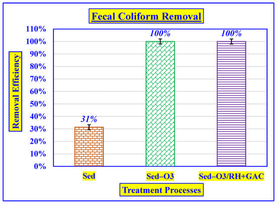 (Kuan et al., 2022) [35] reviewed the 68 studies on the efficacy of various treatment technologies for car wash services station wastewater. Among them, no one studies the removal of coliforms although it is an important parameter for the recycling of vehicle wash station wastewater. Figure 10 shows the 100% reduction in fecal coliform (5 log removal) was achieved by employing the Sed–O3 and Sed–O3/RH + GAC process and complying with the IWQGs recommended standard value of fecal coliforms (Table 4) for Class D proposed by [42].