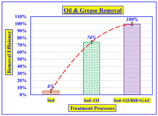 Oil and grease are the most common contaminants present in car wash service station wastewater. The removal of O and G was studied by various research by employing different treatment technologies and integrated methods. The combined two advanced oxidation processes; electrocoagulation followed by nanofiltration using NF 270 and Desal 5DL membranes were studied by [15] for the removal of O and G for car wash station effluent. It was found that 90% removal of O and G was achieved at 30 min of operating time. Moreover, sludge production, high membrane costs, and more electrical energy made it an expensive treatment. In the current investigation, the removal efficiency of O and G was 100% by Sed–O3/RH + GAC and presented in Figure 11. This suggested that catalytic ozonation of sedimented samples followed by adsorption and filtration (Combination-III) was a more efficient method for the removal of O and G in real ASSWW.