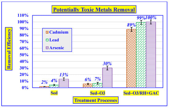The concentration of potentially toxic metals was also measured in ASSWW collected samples. The concentration of cadmium and lead exceeded the [42] recommended IWQGs standard value for class D (Table 2); however, arsenic was in the accepted range. The removal of Cd, Pb, and As were studied in the current investigation and presented in Figure 12. The obtained results are in support of novel hybrid system effectiveness that removed potentially toxic metals from ASSWW and meets the acceptable range (Table 4). Otherwise, tertiary-stage treatment is required for the effective removal of potentially toxic metals that are mainly comprised of membrane technology [38]. The maximum removal efficiencies of 89%, 99%, and 100% of Cd, Pb, and As were achieved, respectively, by the catalytic ozonation of the sedimented sample followed by the adsorption and filtration process.
