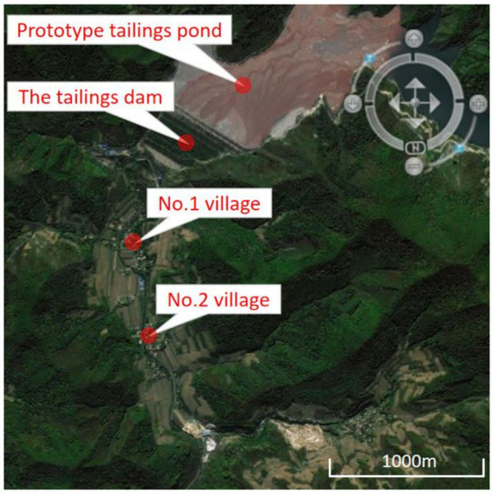 The original tailings pond is surrounded by mountains to the south, west and north, with two ditches at the end of the pond. The overall Y-shaped ditch opens to the north and east, which section is U-shaped, sloping from south west to north east. The elevation of the bottom of the ditch varies from 240 to 320 m, the elevation of the top of the mountain varies from 490 to 800 m, the maximum height difference is 400 m, the average slope of the longitudinal slope of the bottom of the ditch is about 3.28%, and the topography undulates minimally; this is a typical valley-type tailings pond. The initial dam bottom elevation is 240 m, the dam top elevation is 276 m, the dam height is 36 m; the initial dam upstream slope ratio is 1:1.85, and the downstream slope ratio is 1:1.7. The tailing pond sub-dam is of an “upstream type”, the dam top elevation is 380 m, the sub-dam outer slope ratio is 1:4, and the sub-dam road width is 8 m. The overall slope ratio of the accumulation dam is about 1:5; the total dam height of the tailing dam is 140 m with a total storage capacity of 260 million m3, and the tailing pond is classified as second class according to the Code for the Design of Tailings Facilities (GB 50863-2013). Village No. 1, with a population of 400 people, is 600 m downstream of the tailings pond, and village No. 2 is less than 1 km away. Due to the presence of important towns and industrial and mining enterprises downstream of the tailings dam, the grade of the prototype tailings pond is increased to first class, as shown in Figure 1.