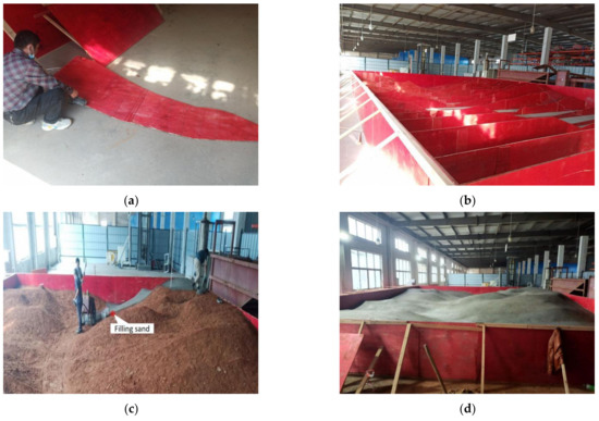 Indoor test modeling. (a) Cut off panel. (b) Standing plate. (c) Fill sandy soil. (d) Conservation. (e) Stacking of sub-dams. (f) Final model.