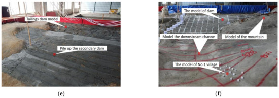 However, the tailings flow from a dam breach spill is a water–sand mixed slurry composed of porous tailings particles, which is essentially a non-Newtonian fluid with complex rheological properties (unlike water, which is a Newtonian fluid), and its mobility is between that of debris flow and water flow [20,21]. Numerical simulations would simplify the boundary conditions and material properties of tailings ponds, and with more constituent elements of tailings ponds and complex dam-break mechanisms, the accuracy of conclusions reached from a single method of numerical simulations applied to study the evolution of tailings pond dam-break laws is low [22,23,24]. Wang, Guangjin et al. used similar physical model tests to explore the deposition characteristics of tailings on the surface of a dry beach during tailings dam stacking and the evolution of the infiltration line in the dam body [25]. Guangzhi Yin et al. focused on a tailings pond. A 1:200 physical geometry model was developed to analyze the stability of tailings dams of different heights under different operating conditions, and this was used to design a prototype tailings pond.