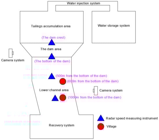 In the study of many mechanical problems, direct tests on the entity are costly and limited, and can only be applied to some specific situations; they also do not have universal significance, as it is difficult to use them to reveal the essence of the phenomenon and the general relationship between the quantities. Therefore, many problems are not suitably addressed via direct testing on the entity; similar model tests can replicate the huge scale of the entity, save money, control the parameters and achieve good targeting, prevent the influence of external environmental factors, have easily changeable test parameters for comparison tests, and yield accurate data. Therefore, the similarity of the model plays a decisive role in the test results. In the model-making process, the physical and mechanical properties, accumulation height and accumulation process of the sand, the slope, height and structural characteristics of the model dam, the slope, width and roughness of the downstream trench, the location of the village, the topographic relief and other influencing factors should be similar to the real conditions. Since the process of tailings pond breaching is extremely complex, there are many relevant factors and incompatibility is inevitable. This experiment aims to simulate the process of tailings pond breaching when flooding occurs, explore the evolution of the breaching law, and predict the impact range after breaching. Therefore, for our experimental purpose, the model’s general factors can be relaxed and we need only focus on the similarity of the accumulation effect [26]. For this test, the similarity of water flow hostage sand, the similarity of tailing sand settlement, and the similarity of tailing sand initiation should be satisfied, relative to the model scale λ. The similarity relationships between the other main physical quantities of the model are shown in Table 1. The model simulates the area of 3000 m × 2200 m of the prototype, according to the scale of 1:200; the height of the model tank is set to 1.2 m, and length × width is 15 m × 11 m. The initial dam of the prototype tailings pond is built using a permeable rock dam with a backfilter layer on the upstream slope, with a height of 36 m; above the initial dam, the upstream-type pile construction method is used, with the natural alluvial release of ore scattered on each level of the sub-dam in turn. The dam was built with bulldozers, with 12 levels of sub-dams at elevations of 283.30 m, 291.00 m, 297.66 m, 306.00 m, 313.50 m, 321.4 m, 331 m, 340 m, 349 m, 360 m, 370 m and 380 m. The slope ratio of the outer slope of the sub-dam is 1:4, the width of the roadway between the sub-dams is 8 m, and the overall slope ratio of the accumulation dam is about 1:5; the overall maximum dam height is 140 m. According to the ratio of 1:200, the initial dam height of the test model is 18 cm, and gravel was mainly used as the accumulation material. The ore was placed and compacted on the initial dam of the model. Each sub-dam was constructed in turn, and the overall maximum height of the model dam was 70 cm. the production process is shown in Figure 2. The test device consists of water storage system, water injection system, tailing accumulation area, dam body area, downstream river area, radar velocity measurement system, high-speed photography system, and recovery system, as shown in Figure 3.