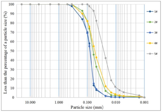 The model sand for this test was taken from the prototype tailing pond, and according to the geotechnical test methods and standards and protocols [27], the particle composition analysis and physical and mechanical property tests were conducted on the tailing sand. The physical and mechanical property parameters of the tailing sand were obtained as shown in Table 2, and the grain size gradation curves of the five groups of tailing sand are shown in Figure 4. The median particle size d50 of tailing sand is 0.0682 mm, mainly concentrated between 0.005 and approx. 0.075 mm, and the gradation inhomogeneity coefficient Cu is 2.76, which indicates poorly graded, powdered tailing sand.
