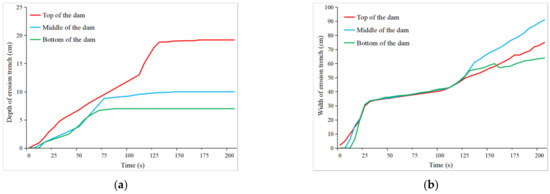 It can be seen from the dam breaching process that the breaching pattern evolves continuously with time during the breaching process, and the changes in breaching at the top, middle and bottom of the dam with time can be measured during the test. After the formation of the breach at the top of the dam, the water flowed downwards sharply, and the width and depth of the breach at the top, middle and bottom of the dam increased rapidly one after another. When a steep can is formed downstream of the breach, the depth of the breach at the bottom of the dam further increases. During the movement of the steep can upwards to the top of the dam, the depth of the breach in the middle and top of the dam increases with corresponding speed, as shown in Figure 6a, while the width increases relatively slowly, so it can be seen that the change in the shape of the breach at this stage mainly develops vertically. At the same time, the dam body on both sides was completely saturated while the breach was undercutting, and cracks and collapses occurred in the dam body. It can be seen that after the steep can moved up to the top of the dam, the width of the breach increased at a faster rate, as shown in Figure 6b, while the depth of the breach increased at a lower rate.