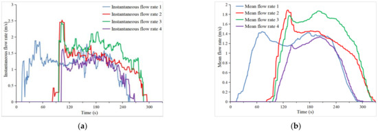 Flood topping dam breach full-field flow velocity change curve with time. (a) Instantaneous flow rate. (b) Mean flow rate.