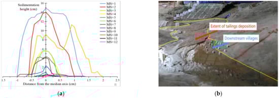 In order to more accurately determine the evolution of the tailing sand accumulation depth and the degree of impact on the downstream, we took the bottom of the initial dam as the starting point and set up a measurement section every 100 m from the prototype, which points were numbered MS+1 to MS+12. After the dam-breaching process, the accumulation width and depth of the tailing sand were measured in each section. The results are shown in Figure 8a. From the physical model test, it can be inferred that most of the houses in village 1 will be flooded by the tailing sand 600 m away from the prototype tailing pond breach, and the houses on higher terrain will not be flooded by the tailing sand but will be flooded with water. Village 2, which is within 1 km, will be flooded, as shown in Figure 8b. The greatest distance of tailing sand siltation is about 1.19 km from the initial dam, and the maximum siltation depth is 29 m. The volume of flood water discharged in the breach is much larger than the volume of tailing sand carried by it, and the downstream terrain of the tailing pond is of a gully type, so the flood inundation range is much larger than the siltation range of tailing sand, which former is 4.76 × 105 m2. The larger the size of the tailing sand, the larger the elevation of the foundation in the same section, the smaller the accumulation depth, and the larger the particle size; the maximum accumulation depth of the tailing sand is 14.5 cm.