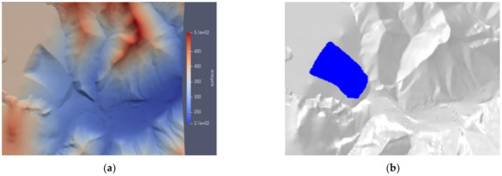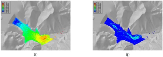 - At 300 s, the sand flow movement basically stopped. The final evolution distance was about 1.43 km, the tail sand accumulation range reached 603,000 m2, and the whole was distributed in strips along the downstream gully, with part of the sand flow entering the gully on both sides. The buildings of the village within 1 km downstream of the dam body were completely submerged—only in the area where the accumulation height of the sand flow front edge was less than 3 m were a small number of village buildings partially submerged. The accumulation height along the evolution path was generally decreasing, and the maximum accumulation area was at the left side of the mountain in front of the dam, with a maximum accumulation height of about 31.5 m.