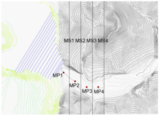 - The tailing sand accumulation on the left side of sections MS1 and MS2 is significantly higher than on the right side, the accumulation at MS3 is low in the middle and high on both sides, and the accumulation on the right side of MS4 is higher than on the left side due to the sand flow being diverted by the mountain. The presence of village buildings will increase the accumulation height in the area;