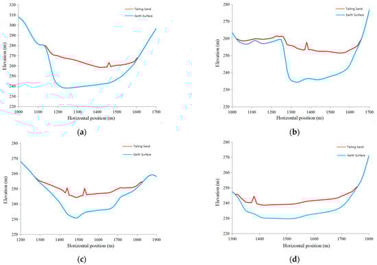 Tailing sand accumulation pattern at each monitoring section. (a) MS1 monitoring cross-section; (b) MS2 monitoring cross-section; (c) MS3 monitoring cross-section; (d) MS4 monitoring cross-section.