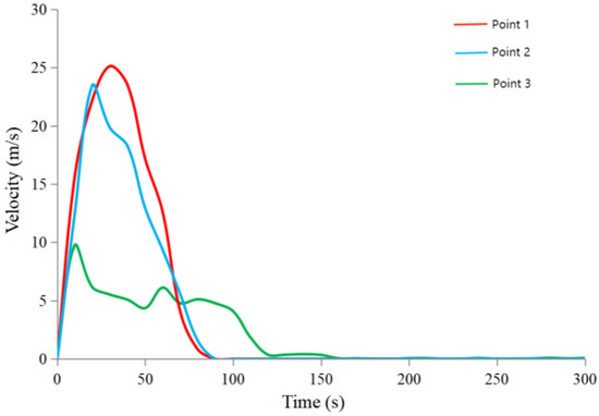 In order to analyze the evolution law of the tailing sand movement during the dam-break process, several monitoring points were selected on the breached tailing sand body (Figure 16), and the velocity–time curves of tailing sand movement at each monitoring point are shown in Figure 17. It can be seen that the velocity of the tailing sand can be divided into two parts during the breaching process: In the front part of the breached body under the action of high gravitational potential energy in the tailing sand, the velocity of the tailing sand increases sharply and then decreases sharply, and the velocity–time curve is basically a triangle with a steep rise and a steep fall. The rear part only shows a small degree of tailing sand discharge; the overall potential energy is small, and the flow velocity of the tailing sand discharge is slow and stabilizes after a long time.