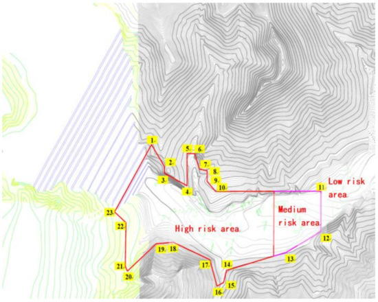 There are differences between the physical model test’s results and the numerical simulation, and the larger value should be used as a reference when carrying out engineering, prevention and control. After a comprehensive analysis, it can be determined that the maximum flow velocity of tailing sand occurs at the bottom of the initial dam, and the maximum flow velocity can reach 35.01 m/s. The final evolution distance of tailing sand after breaching can reach 1.43 km, the accumulation range can reach 60.30 m2, and the maximum accumulation depth can reach 31.50 m. Based on the maximum flow velocity and the accumulation depth of tailing sand, the river downstream of the tailing pond can be divided into risk areas. In this way, relocation measures can be formulated. In high-risk area, the flood flow velocity is fast—the maximum flow velocity is above 14.85 m/s—and the impact force is high, the accumulation height is over 6 m, and the destructiveness is strong. In the medium-risk area, most of the kinetic energy is consumed and the travel speed is greatly reduced, so the maximum flow velocity is below 14.85 m/s. The accumulation height is also reduced—the accumulation height is below 6 m, and the destructiveness is further reduced. In low-risk areas, the tailings accumulation area is outside the inhabited area. The low-risk area is outside the tailings accumulation area; this area includes a large amount of farmland, villages and industrial facilities. This area is not affected by the dam failure, and the warning and personnel evacuation times will be sufficient—see Figure 19.