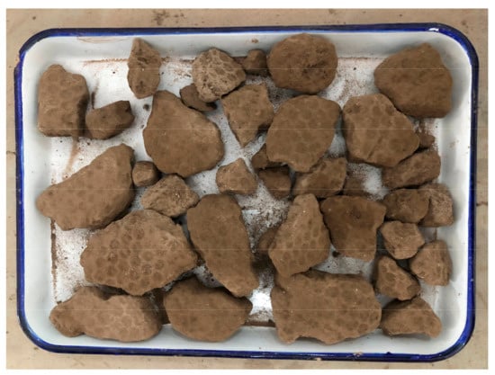 The waste drilling mud for the test was collected from a drilling site in Dongying Shengli Oilfield, Shandong Province. It seems to be very hard and dark brown in color after natural drying and air drying, as shown in Figure 1. After that, it was ground and dried to obtain the waste drilling mud powder (Figure 2). The basic physical and chemical properties of the mud are shown in Table 1. The chemical composition and heavy metal ion content of waste drilling mud are analyzed by an X-ray fluorescence spectrometer, as shown in Table 2 and Table 3, respectively.