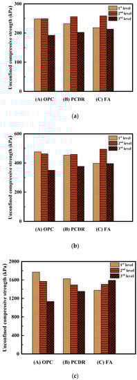 Extremely bad trend chart of orthogonal test results when the initial water content of mud is 50%. (a) 3 days curing age. (b) 7 days curing age. (c) 28 days curing age.