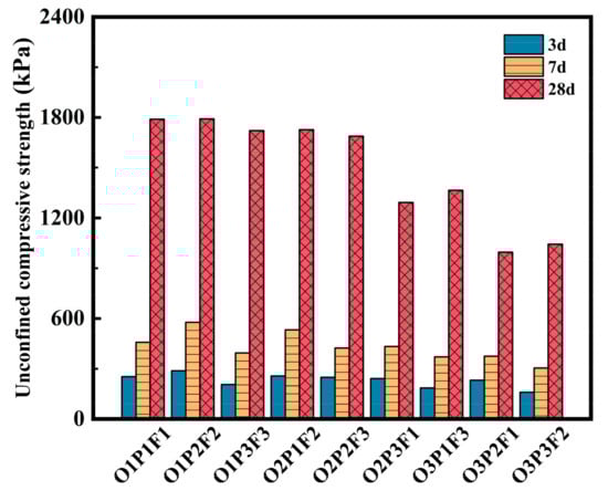 The variation of the unconfined compressive strength of solidified soil samples with waste drilling mud with curing age is shown in Figure 4. It can be seen that, after the mud is solidified, the strength of all samples increases with the increase of curing age. Taking the three proportions of the best, moderate, and worst strength properties as typical examples. The 3 days strength of the solidified soil with the ratio scheme of O1P2F2 was 288.2 kPa, and the 7 days and 28 days strengths increased to 577.5 kPa and 1972.3 kPa, respectively, increasing by 100% and 522%. The 3 days strength of the solidified soil with the ratio scheme of O2P2F3 was 249.0 kPa, and the 7 days and 28 days strengths increased to 423.6 kPa and 1689.0 kPa, respectively, increasing by 70% and 578%. The 3 days strength of the solidified soil with the ratio scheme of O3P2F1 was 231.4 kPa, and the 7 days and 28 days strengths increased to 375.0 kPa and 995.9 kPa, respectively, increasing by 62% and 330%.