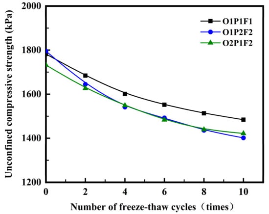 Based on the preliminary screening of nine kinds of curing agent ratios, three optimum ratios of O1P1F1, O1P2F2, and O2P1F2 are obtained, and the unconfined compressive strength test of solidified soil after the freeze-thaw cycle is carried out. The test results are shown in Figure 5. With the increase in the number of freeze-thaw cycles, the strength of solidified soil with three ratios decreased gradually. After 10 freeze-thaw cycles, the compressive strength of O1P1F1 solidified soil is 16.7% lower than that of the sample without the freeze-thaw cycle, which is about 1484.3 kPa. After 10 freeze-thaw cycles, the compressive strength of O1P2F2 solidified soil is 21.9% lower than that of the sample without the freeze-thaw cycle, which is about 1401.7 kPa. After 10 freeze-thaw cycles, the compressive strength of the O2P1F2 solidified soil sample is 17.9% lower than that of the sample without the freeze-thaw cycle, which is about 1421.8 kPa.