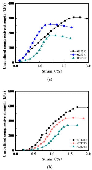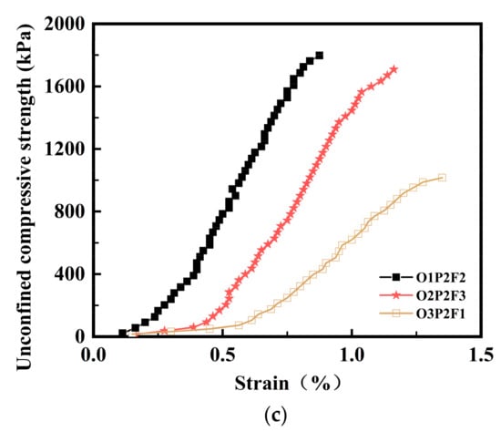 Because the stress-strain curves of nine groups of solidified soil samples under the same curing age are roughly the same, three typical samples with the highest strength, moderate strength, and lowest strength are selected as the analysis object, as shown in Figure 6. When the curing age is 3 days, the proportions of the highest, moderate, and lowest strength are O1P2F2, O2P3F1, and O3P3F2, respectively. It can be seen that the stress-strain curves of the three samples increase at first and then decrease, and the samples have a certain plasticity. When the curing age is 7 days, the proportions of the highest, moderate, and lowest strength are O1P2F2, O2P2F3, and O3P3F2, respectively. The stress-strain curves of the three samples increase at first and then tend to smooth until the specimen is destroyed when the plasticity of the sample attenuates, and the brittleness is gradually obvious. When the curing age is 28 days, the proportions of the highest, moderate, and lowest strength are O1P2F2, O2P2F3, and O3P2F1, respectively. The stress-strain curves of the three samples increase to the failure of the samples when the specimens show complete brittleness and plasticity disappears.