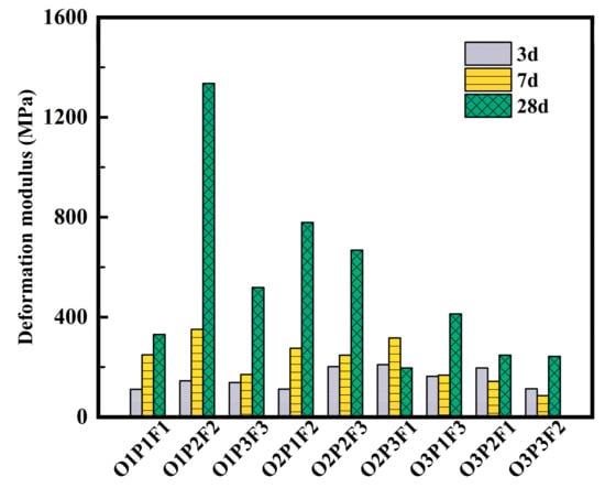 The deformation modulus of solidified soil with drilling waste mud is shown in Figure 7. It can be seen that the deformation modulus of each group of solidified soils roughly increases with the increase of curing age, which indicates that the increase in curing age can enhance the deformation resistance of the sample. Among all the samples, when the curing age is 7 days, the deformation modulus of the sample with O3P3F2 is the lowest, which is only 85.9 Mpa, indicating that the sample with this scheme has the weakest ability to resist deformation. When the curing age is 3 days, the deformation modulus of the sample with the O2P3F1 ratio is the highest, which is about 210.0 Mpa. When the curing age is 7 days, the deformation modulus of the sample with the O1P2F2 ratio is the highest, which is about 351.1 Mpa. When the curing age is 28 days, the deformation modulus of the sample with the proportion of O1P2F2 is the highest, which is about 1335.6 Mpa. This shows that the three groups of samples have the strongest ability to resist deformation under the condition of their respective curing age.