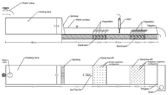 Experiments have been carried out in a large-scale outdoor flume. This flume is 38 m long, 2.0 m wide, and 1.3 m deep, as shown in Figure 1. The longitudinal slope of the flume bed was 0.2%. Two water depths of 20 cm and 30 cm have been used for this experimental study by adjusting the tailgates at the end of the flume. These water depths were chosen based on a real situation in nature since the submerged vegetation typically grows in shallow regions of rivers. Flowing water was supplied by a pump and three valves that feed the upstream holding tank. Water in the holding tank upstream of the main channel was maintained at a constant water level. The desired constant flow rate, which is 100 cm3/s in this study, was obtained by adjusting these three valves. The holding tank has a volume of 90 m3 to keep a constant water level during each experimental run.