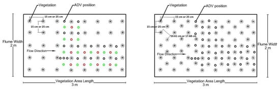 Figure 4 shows the positions for measurement using an ADV (ADV positions) in channel bed with two different vegetation arrangement patterns, namely, the square and staggered configurations. Measurements at 24 ADV positions around vegetation elements provide robust information for detecting flow structure and turbulence. To determine the wake structure behind each vegetation element, the velocity profile was taken at three points in the wakes of some vegetation elements, as shown in Figure 4.