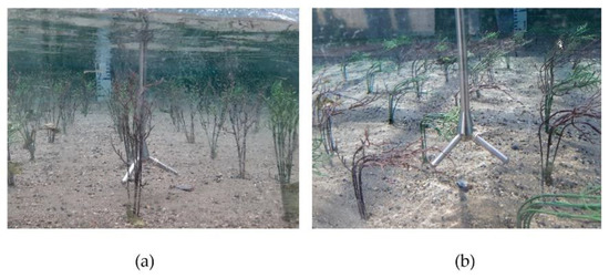 To investigate the influence of vegetation density on flow structure, artificial vegetation with densities of 16, 32, 36, and 72 stems/ were used in this study. It may be sufficient to parameterize vegetation based on stem diameter, density, and the number of plants per area for flow without leaf and non-bending vegetation [46,47].