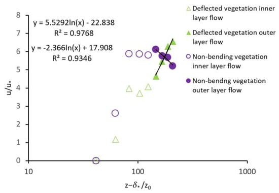 Figure 6 shows velocity profiles in the presence of a deflected and non-bended vegetation patch in the channel bed. One can see from this figure that these velocity profiles deviate from the logarithmic law distribution (the Karman–Prandtl Equation) and are confined to the upper part of the flow in the presence of the vegetation patch. In addition, there exists a very good correlation-ship between u/ and (z − )/z0. Note: a logarithmic profile in the flow’s inner layer cannot be developed due to the presence of vegetation [58].