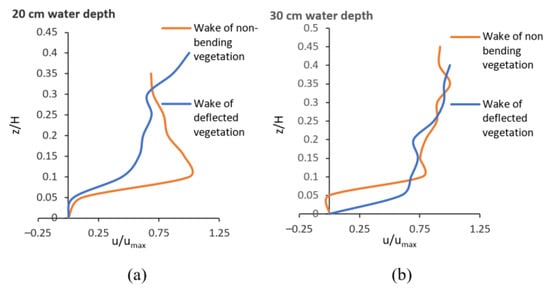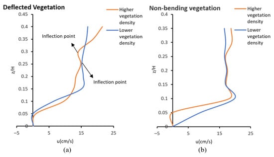 Velocity profiles with high vegetation density (a = 0.624 ) and lower vegetation density (a = 0.256 ): (a) deflected vegetation; (b) non-bending vegetation (water depth: 20 cm and square arrangement of vegetation in the wake behind vegetation (black circles in Figure 4).