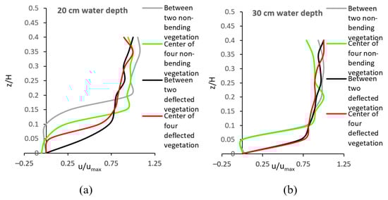 Figure 10 shows the velocity profiles in the presence of both deflected and non-bending vegetation arranged in a staggered layout in flows with different depths of 20 cm and 30 cm, respectively. The characteristics of velocity profiles of flow in the presence of vegetation with a staggered arrangement follow the same trend as those of velocity profiles in the wake of vegetation arranged in a square configuration, as discussed above. However, velocity profiles are more inflectional in vegetation with a staggered arrangement compared to square arrangement. As one can see from Figure 10, the velocity profile for the case of the staggered vegetation arrangement in the wake of deflected vegetation has an “S” shape. In the middle part close to the leaf zone of vegetation, the flow velocity reaches its maximum. In this zone, the drag force causes an appreciable retardation of the mean velocity; in the flow with a depth of 30 cm, this zone is located at 0.1 < z/H < 0.15, and in the flow with a depth of 20 cm, this zone is located at 0.15 < z/H < 0.25. As the velocity increases with the distance above the vegetation zone, the drag resulted from vegetation gradually diminishes, and the shear stresses decline until zero at the free water surface.