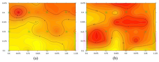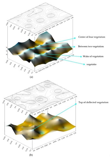In Figure 11, two-dimensional and three-dimensional velocity contours are presented near the bed (at a depth of z/H = 0.1) and at the top of deflected vegetation (at a depth of z/H = 0.4). The depression spot in the contours in Figure 11a illustrates the wake zone of vegetation in the separation flow zone where sediment deposition was observed. Near the bed, velocity is higher between rows of vegetation elements. These graphs demonstrate that velocity in the center of the square formed by four vegetation elements is lower than that in the middle two vegetation elements. This figure confirms the results of Section 3.1.3. Some spikes in Figure 11b indicate high velocities at the interface between the deflected vegetation and non-vegetation layer as inflection points in velocity profiles compared to its neighboring zone.