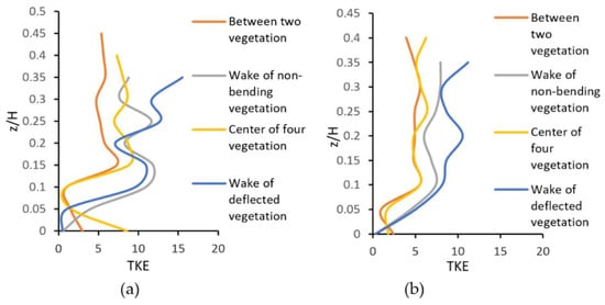 Comparison of Turbulence Kinetic Energy (TKE) between deflected vegetation morphology and non-bending vegetation morphology at different positions: (a) higher vegetation density (a = 0.624 m−1); (b) lower vegetation density (a = 0.256 m−1).