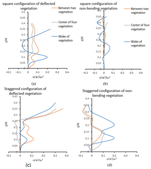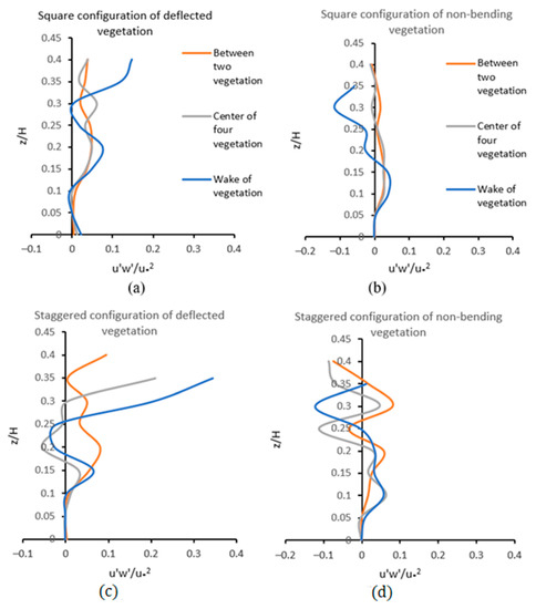 Normalized Reynolds Shear Stress in (water depth = 20 cm): (a) Square configuration of deflected vegetation in the wake of vegetation, between two vegetation elements and in the center of four vegetation elements with λ = 0.04; (b) Square configuration of non-bending vegetation in the wake of vegetation, between two vegetation elements and in the center of four vegetation elements with λ = 0.05; (c) Staggered configuration of deflected vegetation in wake of three random vegetation elements with λ = 0.07; (d) Staggered configuration of non-bending vegetation in wake of three random vegetation elements with λ = 0.1.