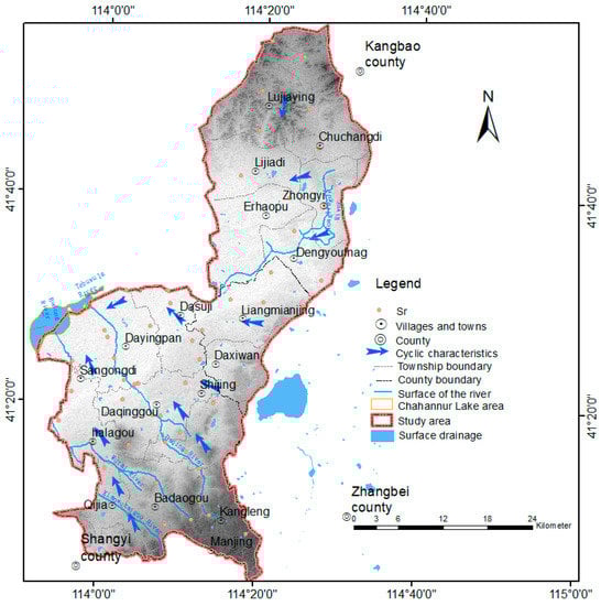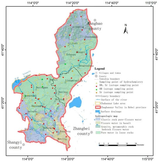The Chahannur Basin is located in Zhangjiakou City, covering an area of about 6757 km2. There are a number of lakes in the basin, including Chahannur Lake. In recent years, due to the excessive exploitation of groundwater, the water level has been declining year by year, and the area of the Chahannur Basin Lake area has been gradually reduced, resulting in land desertification and other problems. Therefore, a comprehensive study of the recharge, runoff, and discharge mechanism of inland water in the Chahannur Basin and the transformation characteristics among groundwater, surface water, and atmospheric precipitation is helpful to formulate targeted groundwater exploitation policies to avoid the continuous decline of inland water level and the reduction in lake area in the Chahannur Basin []. Research on groundwater recharge sources currently uses groundwater hydrodynamics, model simulations, temperature tracers, and hydrochemistry and isotope tracers [,]. Stable hydrochemical indexes and stable isotope indexes remain relatively stable in groundwater runoff []. However, different recharge sources lead to significant differences in hydrochemical and isotope indexes in groundwater. Environmental isotopes have become a practical “key” to studying groundwater recharge sources. A wealth of national and international research has provided a solid foundation for this study. Takuya Matsumoto used Kr isotope and radioactive He as quantitative tracers for groundwater dating and accurately estimated the groundwater age distribution from the coastal plain to the sea area in the North China Plain (the age of groundwater refers to the time that water remains underground, that is, the time that precipitation penetrates into the ground and is isolated from the atmosphere) []. Xiaolin Qiu used the results of helium isotope and neon isotope to show that the groundwater in this area comes from the crust rather than the deeper mantle []. Ahmad Taufifiq studied the control factors and driving mechanism of nitrate pollution in the groundwater system of Bandung Basin, Indonesia, based on the comprehensive analysis of stable isotope ratio, CFC age dating, and socioeconomic parameters []. Todor Anovski et al. applied environmental isotope technology to establish a linear regression model of stable isotope data of precipitation samples to determine the source and recharge mechanism of the Rashche spring []. Jasechko proposed a groundwater quality fraction estimation method based on 14C to better understand the 14C dating method and groundwater resources in California []. Rohana Chandrajith investigated the geochemical and isotopic characteristics of geothermal springs in Sri Lanka and obtained evidence that the geothermal gradient of geothermal springs in Sri Lanka was steeper than expected []. Jianfei Yuan determined the boron content in the geothermal fields of Yangba Well and Yangyi from 52 samples of geothermal water, warm spring water, cold groundwater, and river water, and believed that boron isotope could be used to trace the origin of geothermal water and identify the polluted geothermal wastewater caused by geothermal water []. Peng Wang studied the geochemical properties of hydrothermal fluid in the MGF system, revealed the source of solute, and determined the equilibrium temperature to supply the reservoir []. Using the accumulation rate of 228 Ra in the Dead Sea, Yael Kiro calculated the age and flow rate of high saline water entering groundwater in the Dead Sea []. Xianchun Tang analyzed the relationship between the thermal structure, hydrothermal activity, and geothermal dynamics of ETGB by using helium isotope, gravity and magnetism, and seismic data. At the same time, based on the heat source and geo-geophysical background, he proposed the Kangding and Batang hydrothermal system models in ETGB []. Therefore, based on the isotope and hydrochemical information in groundwater and surface water, the characteristics of the cycle and transformation process of different water bodies can be characterized. In a word, the main purpose of this study is to trace the source of tritium, freon, hydrogen, and 82 oxygen and strontium isotopes. It mainly solves the following problems: using isotopes to determine the recharge and discharge characteristics and hydrochemical characteristics of groundwater in the Chahannur Basin. The research results can provide a reference for the risk caused by the reduction and degradation of the lake area in Chahannur Basin.
