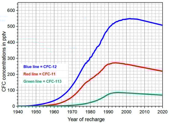 CFC dating is applicable to young water with an age less than 60a, but the application of CFCs requires certain conditions, such as temperature, the thickness of the aeration zone, external pollution, and other apparent effects on CFCs. The application should be analyzed based on the actual conditions [,,,,].