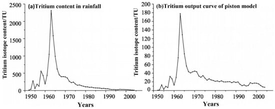 Although the distribution and variation characteristics of tritium isotope in atmospheric precipitation have been studied in China, the series observation data of tritium content in precipitation in most areas are not enough to meet the needs of groundwater age calculation. Recovering the concentration of tritium in precipitation is necessary before calculating groundwater age [,]. The recovery results of tritium content in precipitation are shown in Figure 4a. The atmospheric tritium content from 1952 to 1959 was estimated by precipitation tritium in Changchun []. From 1960 to 1986, the Doney model was used (F1 = 150, F2 = 50). From 1987 to 2007, weighted average precipitation of measured data in Harbin, Qiqihar, and Changchun was used, and single-phase correlation extrapolation between the Harbin station and Ottawa station was used for the missing years []. The Ottawa station data were from the international atomic energy agency (IAEA, https://www.iaea.org/. PHP, accessed on 5 January 2022). In the piston model, the tritium entering water only changes according to the attenuation law, and is shown in Figure 4b.
