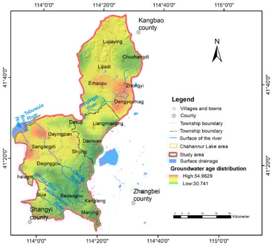 In the Daqinggou, Wutai River Basin, and Chahannur groundwater systems, the groundwater age distribution range is ~30–60a. The groundwater flow direction in this area is generally discharged to Chahannur by runoff from the south and southeast of the working area. The groundwater age increases along with the groundwater flow direction (Figure 5). The water in basalt fissures is directly replenished by meteoric water, which is quick, and the groundwater retention time is short, generally less than 40a. After groundwater runoff to the plain area, the aquifer medium is loose rock and clastic rock with uneven thickness; the groundwater retention time becomes longer in this area, increasing the overall age. The maximum value is 55a.