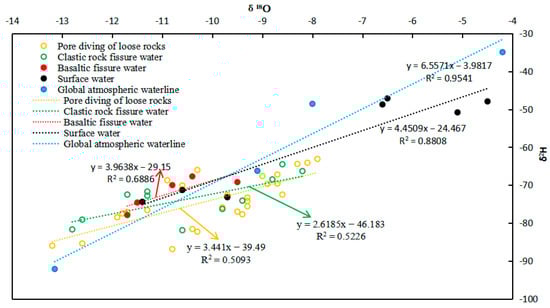 The δ2H ranges from −74.4‰ to −71.3‰, and the δ18O ranges from −11.4‰ to −9.7‰. The δ2H of river water ranges from −50.8‰ to −47.1‰, and δ18O ranges from −6.6‰ to −4.5‰. Groundwater can be divided into three types. The δ2H of phreatic water ranges from −86.9‰ to −63.1‰, and δ18O ranges from −13.2‰ to −7.9‰. Fracture pore water of clastic rocks has δ2H ranging from −81.9~−64.5‰, and δ18O value ranging from −12.6~−8.2‰. Basalt fissure pore water δ2H ranges from −77.9~−67.7‰, and δ18O ranges from −11.7~−9.2‰. Results show that surface water (spring water, river water, and reservoir water) of the delta and δ2H and δ18O value changes of a smaller range of various types of groundwater change has a broader range, potentially reflecting variations in the groundwater aquifer medium, burial conditions and hydrological cycle, and many other more complex hydrogeological conditions. The influence of these factors needs further investigation into the groundwater runoff relationship.