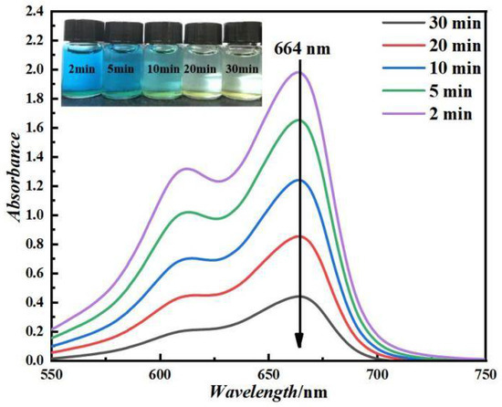 The absorbance was different for different concentrations of MB solution at 664 nm; the lower the concentration of MB, the lower the absorbance and the lighter the color of the solution, the better the removal effect. The results are shown in Figure 1, and the treatment times are 2 min, 5 min, 10 min, 20 min and 30 min from left to right. All degradation experiments were repeated thrice.