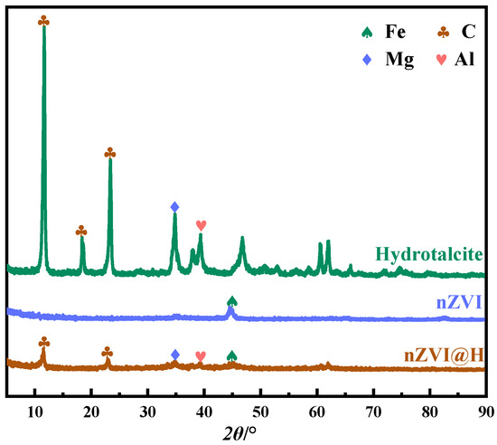 Figure 3 shows the XRD results of hydrotalcite, nZVI and nZVI@H, respectively. It is observed that the elements corresponding to the central characteristic peaks (2θ = 7.6°, 22.8°, 34.5°, and 38.5°) of the hydrotalcite spectra are C, Mg, and Al, respectively. The spectra of both nZVI and nZVI@H appear as diffraction peaks on the crystalline surface of α-Fe (110) in the body-centered cubic structure, proving that Fe0 is the main component of both, with the characteristic diffraction peak of 2θ = 45°~46°. Due to the weak crystallinity of Fe, a weaker Fe0 peak is observed in nZVI@H. In the XRD spectrum of nZVI@H, the appearance of C, Mg, and Al characteristic peaks, in addition to Fe0 peaks, indicates that the preparation of the composite was successful.
