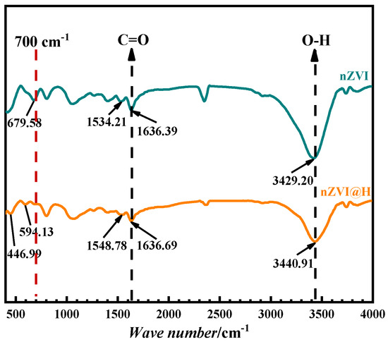The Fourier spectra of the surface groups of nZVI and nZVI@H are shown in Figure 4, where nZVI and nZVI@H have peaks ranging 3400~3500 cm−1 that are attributed to the bonding of O–H to Fe0 or its oxide–hydroxide. The common spectrum at 1630~1640 cm−1 comes from the vibration at C = O, which is caused by the adsorption of CO2 in the air. The weaker peaks in nZVI and nZVI@H are 1534.21 cm−1 and 1548.78 cm−1, which come from the oxidation of Fe0 to form Fe3O4, Fe2O3 and FeOOH on the surface, or the introduction of the anhydrous ethanol group during the preparation of the material. At the same time, a high intensity band less than 700 cm−1 is not detected on the surface of nZVI@H compared with that of nZVI, indicating that the antioxidant properties of nZVI@H are enhanced. The enhanced oxidation resistance helps the adsorbent to remain active for a longer period of time and improves the adsorption capacity [28].
